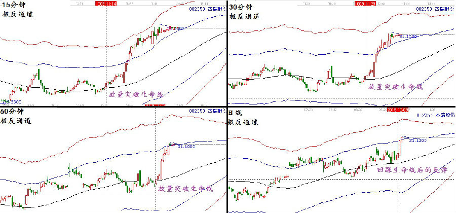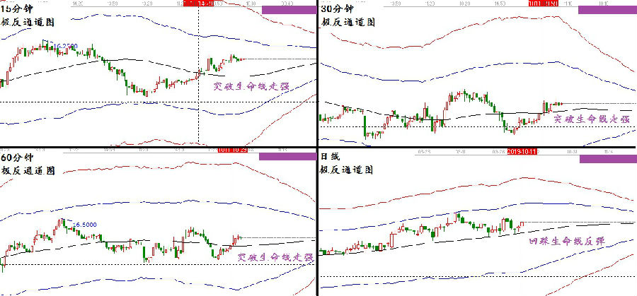 趨勢共振模型一類:以極反通道生命線為判斷依據,生命線是判斷市場趨勢強弱的分界線,可以快速直觀的判斷出市場短期,中期,及長期的趨勢強弱,如果各周期都是處于強勢區,這就是一種共振。因此,在實戰交易中,投資者關注周線,日線,60分鐘,30分鐘,及15分鐘,如果這幾個周期都是處于生命線附近,走勢協同,就會出現短期的快速拉升走勢。