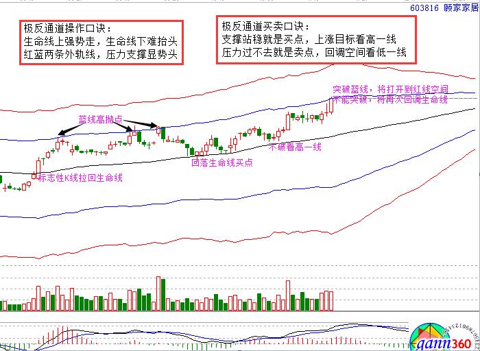 操作口訣:生命線上強(qiáng)勢走,生命線下難抬頭,紅藍(lán)兩條外軌線,壓力支撐顯勢頭。生命線是趨勢強(qiáng)弱的分界線和重要的支撐阻力線。
