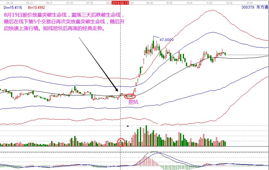 東方通:8月19日股價放量突破生命線,震蕩三天后跌破生命線,隨后在線下第5個交易日再次突放量突破生命線,隨后開啟快速上漲行情。短線挖坑后再漲的經典走勢。