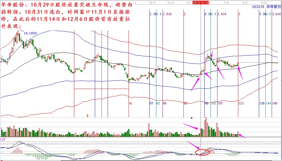 華帝股份:10月29日股價放量突破生命線,趨勢由弱轉強。10月31日選出,時間窗口11月1日直接漲停,在此后的11月14日和12月6日時間窗口股價皆有放量拉升的表現;