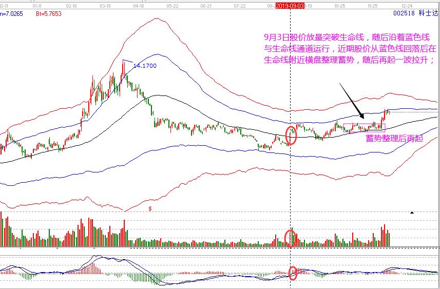 科士達:9月3日股價放量突破生命線,趨勢由弱轉強,隨后沿著藍色線與生命線通道運行,近期股價從藍色線回落后在生命線附近橫盤整理蓄勢,隨后再起一波強力拉升。