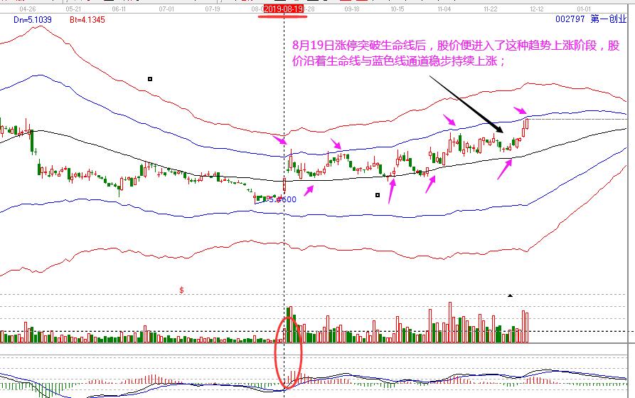 第一創業:8月19日股價漲停突破生命線后,股價便從弱勢轉強,進入了這種趨勢型的上漲階段,股價沿著生命線與藍色線通道穩步持續上漲。