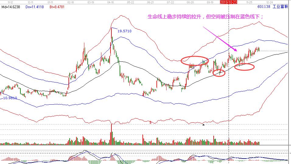工業富聯:近期股價攻擊藍色線后回踩至生命線,隨后股價沿著生命線上行。但是上漲空間并不能突破藍色外軌線,壓制在生命線與藍色線的空間。