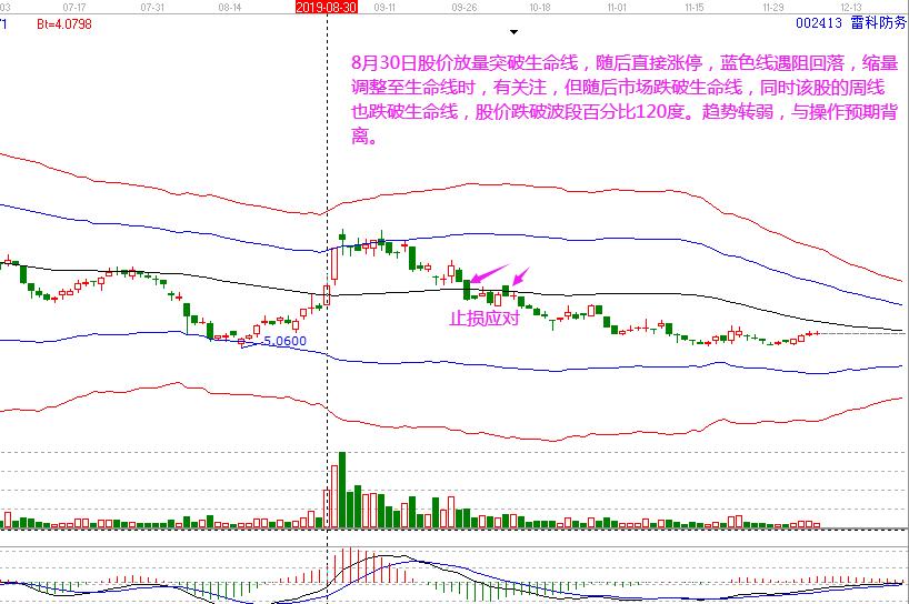 雷科防務:8月30日股價放量突破生命線,隨后直接漲停,藍色線遇阻回落,縮量調整至生命線時,有關注,但隨后市場跌破生命線,同時該股的周線也跌破生命線,股價跌破波段百分比的120度,趨勢轉弱,與操作預期背離。