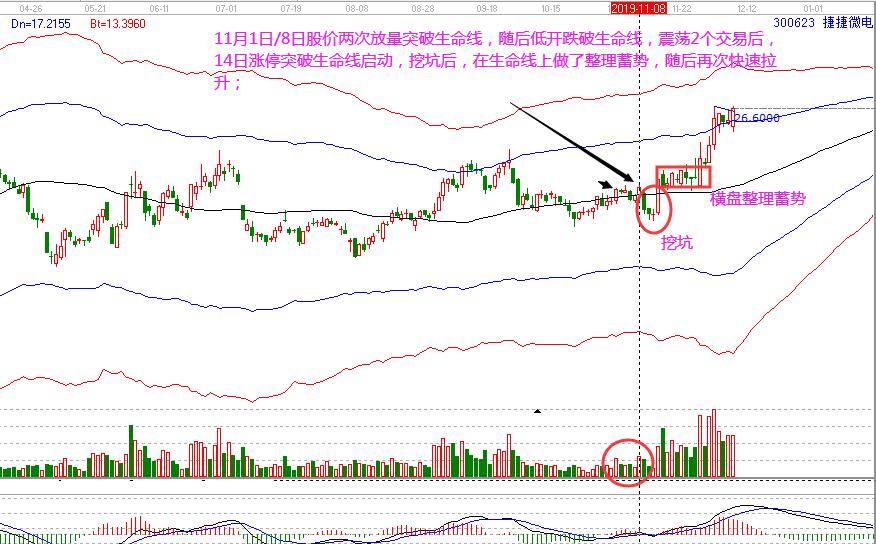 捷捷微電:11月1日/8日股價兩次放量突破生命線,隨后低開跌破生命線,震蕩2個交易后,14日漲停突破生命線啟動,挖坑后,在生命線上做了整理蓄勢,隨后再次快速拉升。