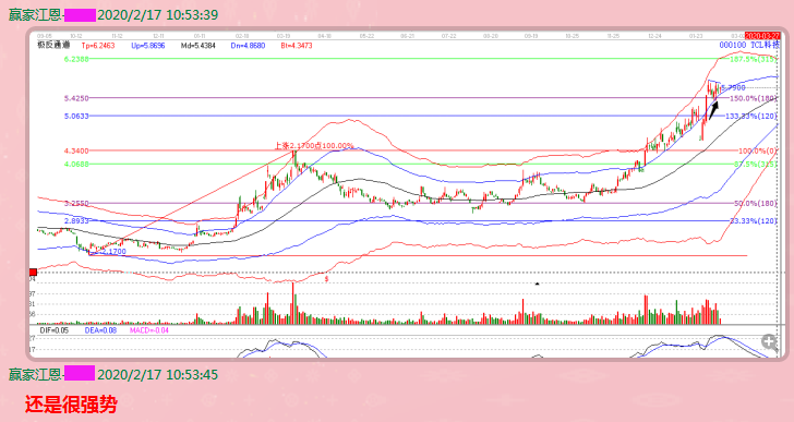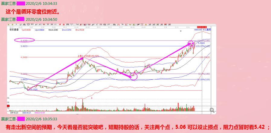 下圖是TCL科技在2月6日的技術(shù)分析圖形,具體的作圖方法是,以2018年10月19日的低點(diǎn)和2019年3月25日的高點(diǎn)為起始點(diǎn),作出江恩波段百分比延伸線(江恩經(jīng)典價(jià)格循環(huán)分析工具之一),保留120度和180度分割(后期調(diào)整為135度和180度,更契合市場的歷史走勢)。從圖中可以看到,股價(jià)在從最低點(diǎn)2.17起漲后,紅色線見頂回落,并最終在江恩波段百分比120度與180度空間完成止跌,這個(gè)分割位是我們在實(shí)戰(zhàn)運(yùn)用中頻繁強(qiáng)調(diào)的調(diào)整位。止跌之后震蕩上行,并在2019年12月17日突破站上了100%的零度位,此為前期高點(diǎn),股價(jià)在突破后,進(jìn)入到了新的空間,即100%到133.3%-150%分割區(qū)間,價(jià)格波動(dòng)空間為4.34-5.42。2月6日股價(jià)放量上攻,突破了5.06直接挑戰(zhàn)5.42,此時(shí)我們要關(guān)注的是,該循環(huán)空間是否會(huì)打開,股價(jià)進(jìn)入新的空間。其關(guān)鍵點(diǎn)就是,價(jià)格突破5.42。此位置對(duì)應(yīng)了33.33%-50%區(qū)間。當(dāng)天最終股價(jià)放量漲停突破。