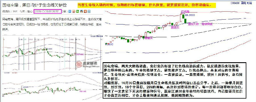 對照圖形,10月30日盤前按照周日生命線共振及時間窗口選出分享。之后,一路攀升到藍線,到紅線。18個交易日,25%的漲幅,再次得到市場的肯定。每一次獲利都要明明白白,賺錢了一定要記下買賣的依據和信號,贏家江恩20余年總結的經驗技巧,自己驗證用過后才會真正的相信,才會去敬畏和遵從規則,做到順勢而為。