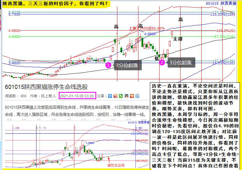 陜西黑貓,本周學習標的,周一分享符合漲停生命線模型,今日再次揭秘短期時價秘密。先看空間,股價自4.98的回調在120-135度區間止跌開漲;對比前一波一樣是此區間展開快速行情。同樣的價格位,同樣的拉升角度,你看到了嗎?時間呢,最簡單的對稱模式,兩個高點卡住了低點,等距+3分位+生命線=三天三板!當前315度為關鍵支撐,不破看至下個時間點!具體可以自己作圖查看。