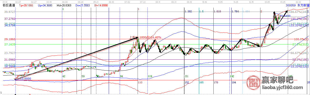 再來看看我們持續跟蹤2年之久的東方財富,你想要的轉勢信號。不管是中期波段還是短期波動,贏家江恩未來先知時價圖全部打盡。每一個箭頭,都是一段波段,都是一組低吸高拋,都是標準的買賣信號,市場到底有多美,你不懂江恩的視角,永遠也看不到。很多人會問,江恩技術準不準?看看東財的圖,已經走出來的高低點,有多少落到了江恩線上,那就有多準。不是準不準,而是當你一旦捕捉到了個股的規律,準的你不敢相信。這就是股市,這就是江恩時價技術的魅力,好圖只遇有心有緣之人,想深入學習,聯系我吧!