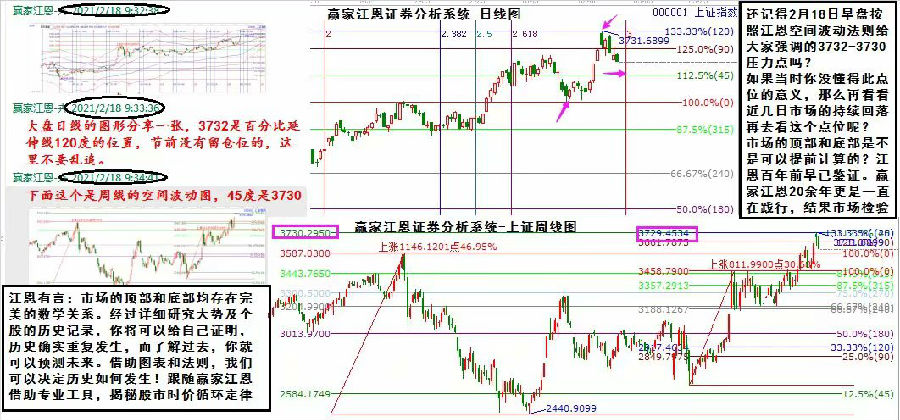 江恩有言:市場的頂部和底部均存在完美的數學關系。經過詳細研究大勢及個股的歷史記錄,你將可以給自己證明,歷史確實重復發生,而了解過去,你就可以預測未來。借助圖表和法則,我們可以決定歷史如何發生!跟隨贏家江恩借助專業工具,揭秘股市時價循環定律! 還記得2月18日早盤按照江恩空間波動法則給大家強調的3732-3730壓力點嗎?如果當時你沒懂得此點位的意義,那么再看看近幾日市場的持續回落再去看這個點位呢?市場的頂部和底部是不是可以提前計算的?江恩百年前早已鑒證。贏家江恩20余年更是一直在踐行,結果市場檢驗。