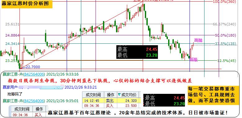 今日差價任務完成,小5個點的利潤落袋。對照圖形去看,早盤指數直接探至日線生命線、30分鐘藍線構成左側關注信號,按照時價信號低吸博差價,如期抵達阻力高拋離場。而再看預期的支撐23.25,阻力24.34;實際日內最低23.2,最高24.45,誤差0.05-0.1,在23.5低吸,24.32高拋,近1元的利潤不算多,但是日積月累呢?如果你也可以看清股價的波動空間,好股可以做的更好;被套亦可通過差價早日解套。技術決定利潤,贏家江恩基于百年江恩理論總結得出的技術體系,日日被市場驗證。在市場里的每一筆交易,都是尊重市場信號,按照工具規則去做,絕不是貪婪恐懼。