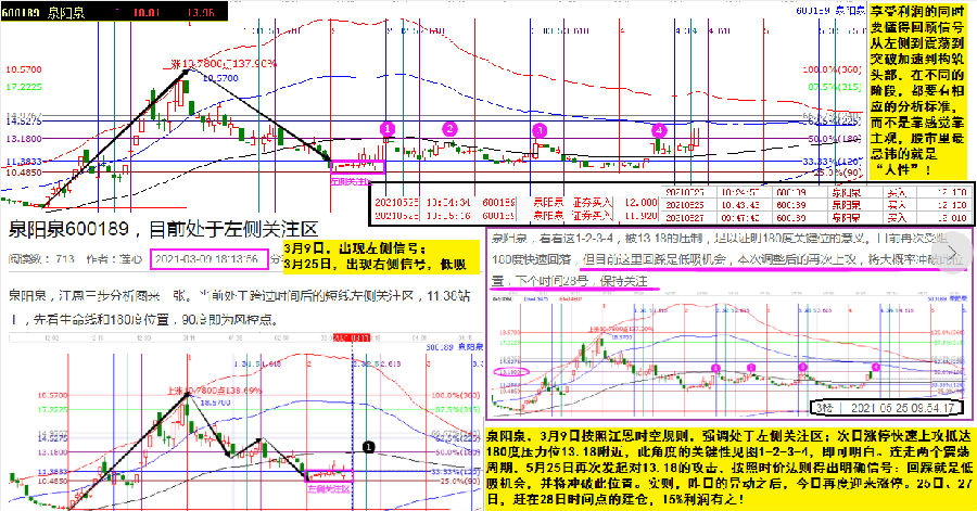泉陽泉,3月9日按照江恩時空規則,強調處于左側關注區;次日漲停快速上攻抵達180度壓力位13.18附近,此角度的關鍵性見圖1-2-3-4,即可明白。連走兩個震蕩周期,5月25日再次發起對13.18的攻擊,按照時價法則得出明確信號:回踩就是低吸機會,并將沖破此位置。實則,6月2日的異動之后,3日再度迎來漲停。25日、27日,趕在28日時間點的建倉,15%利潤有之!