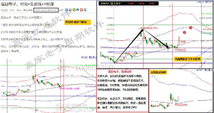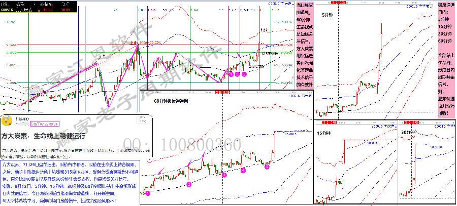 7月29日盤前選出,時價有序和諧,股價在生命線上符合規則。之后,穩步上攻抵達藍色上軌線和315度壓力區。受阻藍線震蕩洗盤不可避免,百分比240度支撐及日線60分鐘生命線支撐,均是短線關注信號。同時:8月12日,5分鐘、15分鐘、30分鐘及60分鐘同步站上生命線形成日內共振信號,今日強勢封板直接漲停突破藍線,打開新空間。