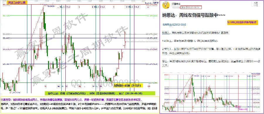 納思達,5月20日本輪最低點選出,3倍時間+45度價格引發這波上漲,2個多月漲幅達60%~~~回顧對比5月20日和當前的圖形,還是這組時價線,但“低點”已經赫然留在那里。周線進入3.382時間窗口,空間上225-240度為壓力區,這里能否再度突破,打開到315度的空間,拭目以待。