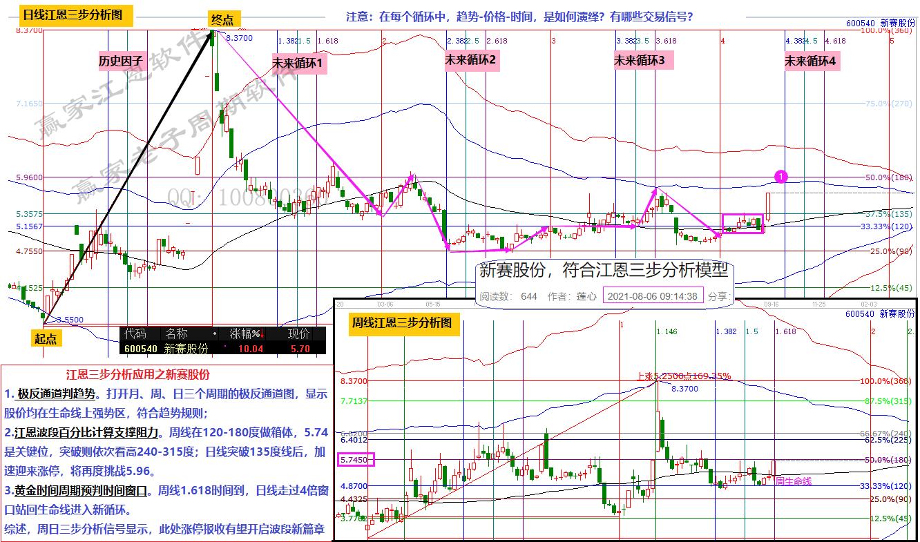 2.江恩波段百分比計算支撐阻力。周線在120-180度做箱體,5.74是關(guān)鍵位,突破則依次看高240-315度;日線突破135度線后,加速迎來漲停,將再度挑戰(zhàn)5.96。