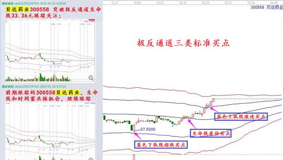 2. 穩健性生命線最佳買點:生命線為贏家江恩最佳買點,首先個股向上突破生命線,進入強勢區域,個股處于強勢啟動位置,且在生命線有價格支撐,所以在生命線附近參與就最為安全。2月12日,貝達藥業,在生命線最佳穩健買點選出,18號生命線附近再次提示跟蹤,當天開始啟動,25號到達藍色上軌線附近,生命線——藍色上軌線,6個交易日,短線13%利潤到手。