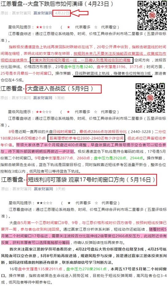 大盤五一節(jié)后的反彈,在5月17日時間窗口宣告結束。贏家江恩從4月22日盤中明確提示風險,到等待5月8日-9日時間窗口備戰(zhàn)交易,并于2800-2840區(qū)間進行短線抄底建倉,到5月17日2966點附近見頂回落。投資者再次經(jīng)歷了一次市場的完美漲跌,從0到360度完成一個漲跌循環(huán)。對于市場的判斷,贏家大勢分析都有展示,在此我們做下回顧。