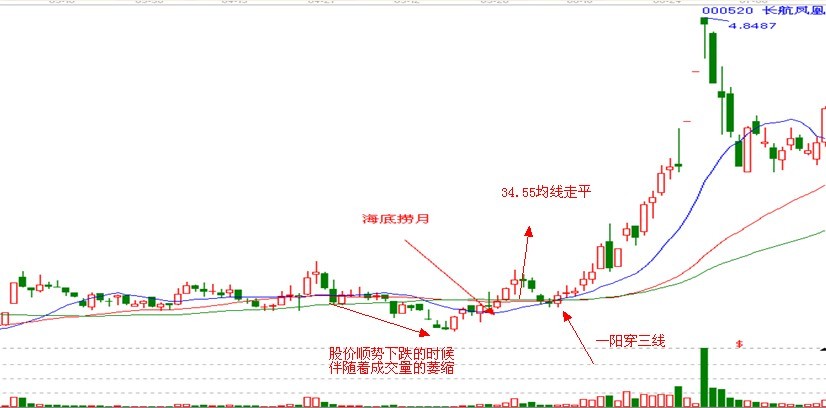 二:13日均線隨成交量的穩步放大,股價穩步攀升,13日線重新上穿55均線,這個過程就是海底撈月。