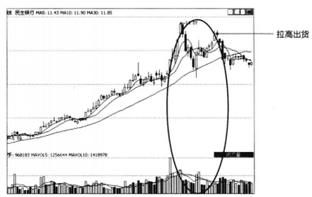 上圖是民生銀行(600016)的日K線(xiàn)圖和成交量,在股價(jià)上漲一大段后,主力已拉到目標(biāo)價(jià)位,然后快速拉高出貨。