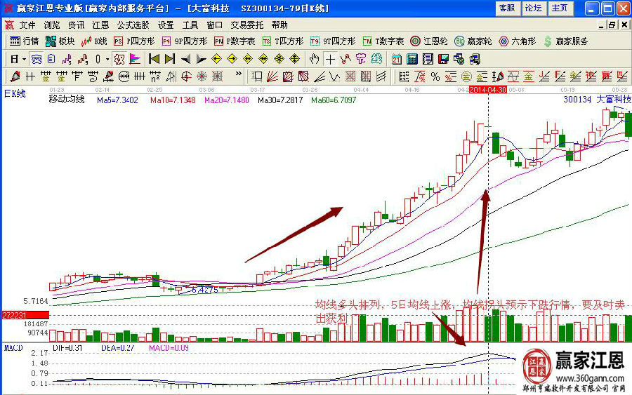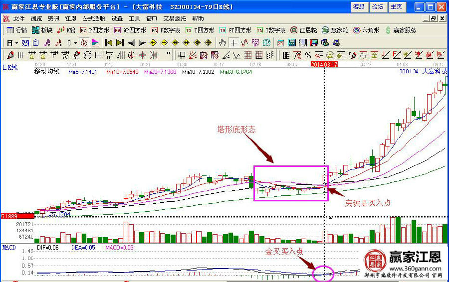 如圖大富科技(300134)在2013年底到2014年初的股價走勢形態,在均線的簡單走勢配合中,前期的股價走勢是一直在低位橫盤整理的蓄勢形態,雖然有緩慢的拉升,但是上漲的幅度不是很大,之后股價在14年3月份的時候形成了塔形底的形態,在3月17日形成一根大陽線向上突破,對應的成交量明顯的放大,說明有資金入場,macd指標形成金叉買入的操作信號,均線多頭排列預示著上漲的操作行情,投資者可以積極的介入。