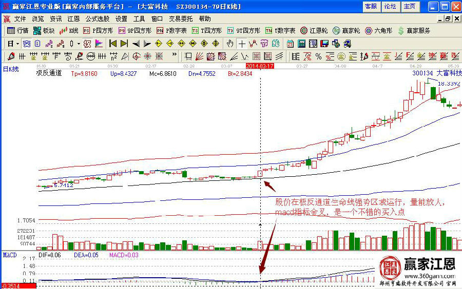 如果投資者不放心買點的位置,可以通過贏家江恩的極反通道進行研判,如圖在14年3月17日的時候,股價以漲停陽線站穩生命線并向上拉升,在強勢區域中運行,量能不斷的放大,macd指標金叉,是一個不錯的買入點位置。