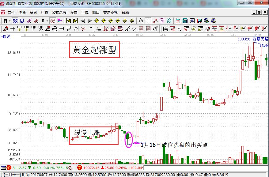 西藏天路就是在一帶一路、水泥板塊和黃金板塊的混合概念,主力資金介入比較深,本年度1月16日,黃金起漲模型提示主力資金介入,并提示買點,其后該股便走了幾個波段的漲幅。