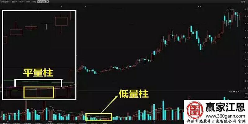 我們運用股票軟件所選出的一只股票的截圖。這一只股票,當人本人運用這兩種量柱的方法輕松拿到了40個點。圖中黃框內的位置其實就是很多人說的量坑位置,在這個位置的成交來滾你是非常小的,所以就是低量柱,它是成交量最小的一個階段,這根量柱是市場起漲的先兆。白框內黃色小框里的兩根量注基本上是一樣的,所以說就是平量柱。