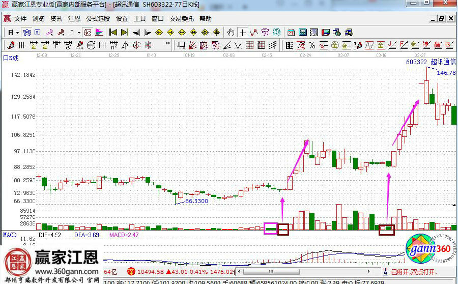 所謂的黑馬量柱就是平量柱+低量柱。具體的描述就是即使平量柱又是低量柱的,低量柱和平量柱是相鄰的。這些都是主力已經高度控盤的表現,是非常容易產生黑馬的,所以值得關注。接下來看超訊通信的走勢圖。