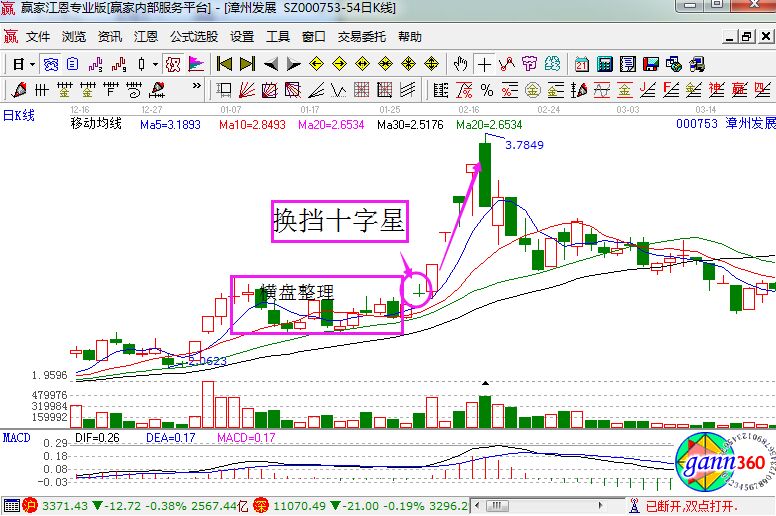 當(dāng)換擋陰十字星出現(xiàn)在橫盤整理區(qū)域的上方時(shí),通常是被許多人誤解為頂部已經(jīng)來(lái)臨而不敢介入,但是隨著次日一根陽(yáng)線將十字星實(shí)體完全包住,股價(jià)展開(kāi)了另一輪的升勢(shì),在均價(jià)線系統(tǒng)支持股價(jià)上漲的情況下,如換擋陰十字星出現(xiàn),投資者應(yīng)該大膽介入。