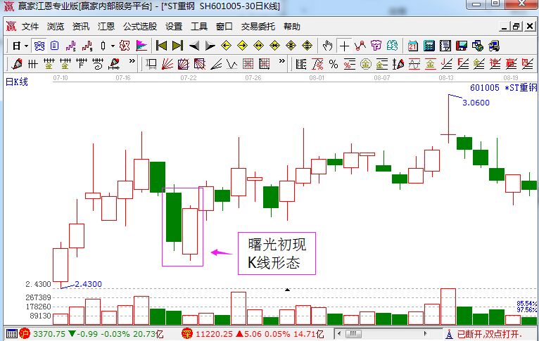 大家在運用曙光出現組合的識貨,還可以有一個附加條件,這樣就可降低投資者的風險。那就是該形態的第二根陽線的最低價必須是13個交易日以來的最低價,這主要是為了避免投資者在熊市中貿然追高,增大操作風險。如下圖所示。