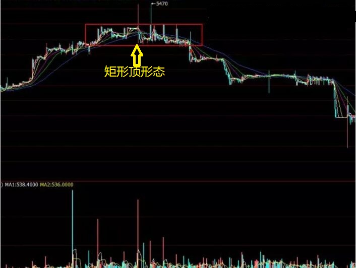矩形頂形態是怎么樣子的?它其實指的就以在一個頭部區域走出了一個箱體走勢,在這個區域內K線頂部有阻擋,下端有支撐,在價格上大致維持了一個箱體震蕩的格局。如下圖所示。