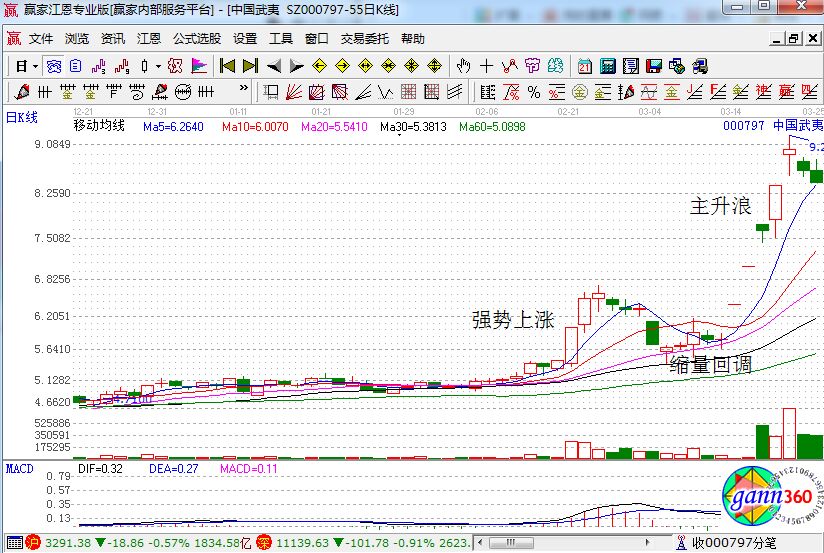 上圖是中國武夷在2013年1月至3月份的走勢圖,在上圖中,該股就走出了非常明顯的黑馬三浪形態。第一浪以大陽線強勢上漲,之后縮量回調,股價沒有跌破30日均線,并且再次得到支撐,股價縮量回調的時間是8天符合兩個星期之內,之后,股價便開始強勁的主升浪行情,顯然是該形態的典型運用。