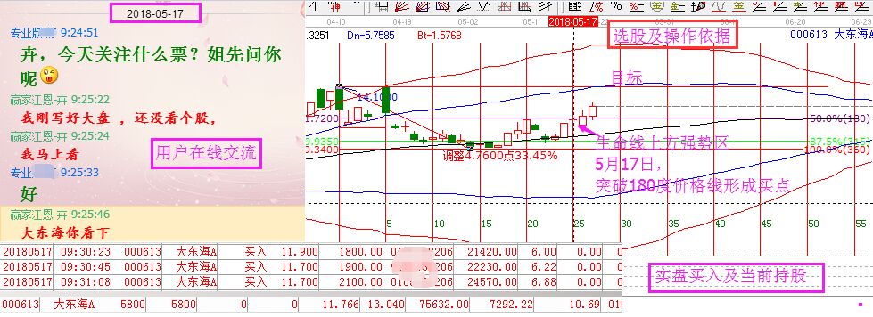 在5月17日依據贏家江恩的市價法則選擇,時間點突破江恩180度壓力線,形成買點。用戶按照規則同步操作,持股3個交易日,短線獲利已達10%。短期目標上方藍線,不能放量突破短線兌現換股,如下圖所示。