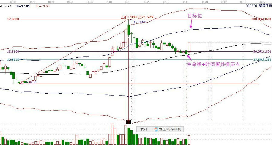 強勢個股從紅色上軌線一路回落至生命線位置,形成生命線最佳買點,同時和輪中輪變盤點時間窗形成共振,時間 生命線,促使趨勢反轉。生命線啟動,目標位就是藍色上軌線,買點和賣點直觀清晰,即使股市新手也能結合極反通道賺取利潤。如下圖所示。