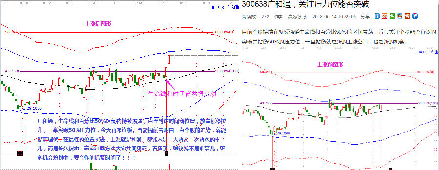 生命線和百分比50%區間內持續震蕩,直至到達時間窗位置,放量漲停拉升,依據突破50%壓力位,連續兩個漲停板。當能提前看明白一只股票的走勢,就能提前埋伏,在最佳的位置買進,上漲就是利潤。如下圖所示。