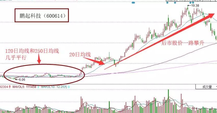 1、 并線三線開花。它指的就是在三線開花的初始點,120日均線與250均線是處于極度接近的平行狀態,此時20日均線從下向上穿越這兩條均線的技術走勢,形成均線的金叉穿越。穿越后如果股票價格走勢在出現大幅放量的上漲行情,就預示著并線三線開花走勢的成立,并將預示著均線系統將要“開大花”。它隱含的技術意義就是股票價格要上行。如下面的鵬起科技走勢圖。