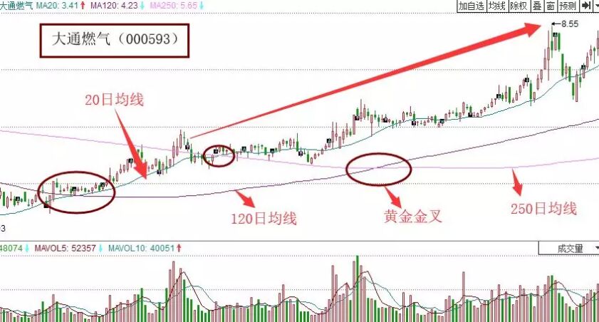 2、 順向三線開花。它指的就是在三線開花的初始點,120日均線與250日均線是順向交叉狀態,即120日均線從下向上穿越250日均線,形成兩條長期均線的黃金交叉,此時20日均線從下向上穿越這兩條均線交叉點的技術走勢形態。這種走勢形態,在穿越的過程中成交量是有效放大,那就預示著該形態的走勢成立,當然這個方法并不能讓我們買在啟動的最低點,但是我們可以在交叉點的當日發現它的趨勢,這樣就可以做到獲利,如下面的大通燃氣走勢圖。