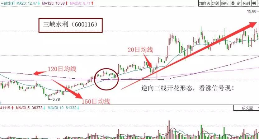 3、逆向三線開花。它指的就是在該形態的初始點,120均線與250日均線形成死亡交叉,此時20日均線由下向上穿越這個交叉點的技術走勢形態。一般股票形成這個走勢的話,就預示著個股將要走牛,同時應該有成交量有效放大的支持。如下面的三峽水利走勢圖。