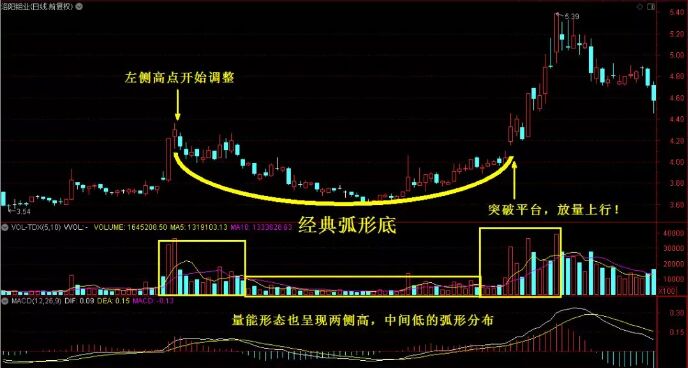 從上圖我們可以看到,這個(gè)經(jīng)典的形態(tài),可以分為圓弧的左半部分與圓弧的右半部分。左半部分是跌的過程,而右半部分是漲的過程,一般是比較流暢,一般是比較曲折。漲的過程,尤其是在面臨突破前,不可避免地會(huì)面臨著反復(fù),只要能保持相對(duì)強(qiáng)勢,成交量也能出現(xiàn)明顯放大,最終一旦突破上去,漲起來的空間就會(huì)更廣闊。