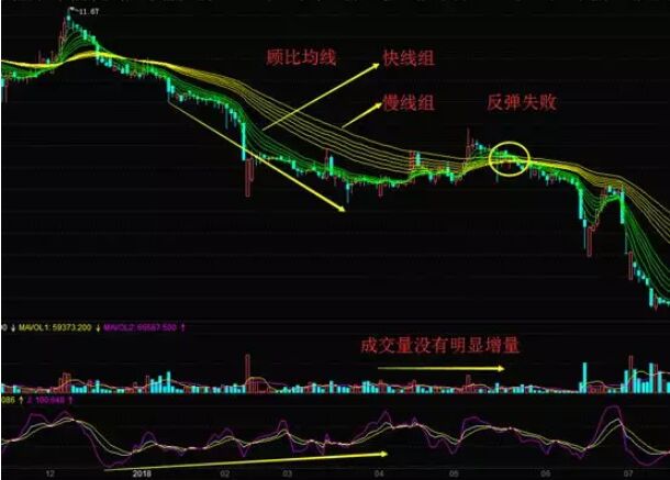 其后,K線果然開始止跌盤整,后市開始慢慢回升顧比均線快線組開始上穿慢線組,其中3、5、8線突破慢線組,但是不就就出現跌破慢線組,多頭很快的湮滅,顯示反彈那失敗。