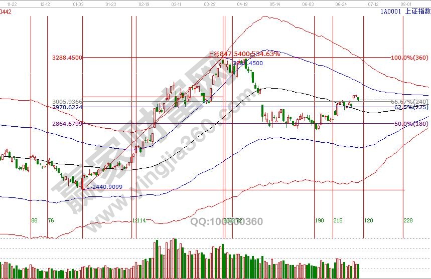 A股3、4號時間窗口及3051-3065極反通道多周期共振反壓位,時間與空間的解讀在6月28號及1號在分析中有闡述,同時今天收盤價3015與工具測算位置僅僅相差一個點。目前短周期的周期共振警示還沒有解除,2號盤中在贏家江恩系統學員區已談到共振會引起傳遞,目前市場正在按預期逐級回踩確認短期生命線,回撤期間有參考意義的位置是60分鐘生命線,贏家學員們可以結合工具盤中跟蹤等待信號確認。整體上工具還未給出反彈結束信號,同時這里也不具備大幅開倉條件,提高止賺位保持一定持倉做應對,7月4號盤中壓力是135度3055點、90度3036點,盤中支撐是0度2997點、315度2978點。操作策略,指數極反通道生命線上安全區域震蕩上攻,反彈動作還在延續,3051-3067區間附近高倉位可以分批兌現利潤,整體持倉保持3-5成。