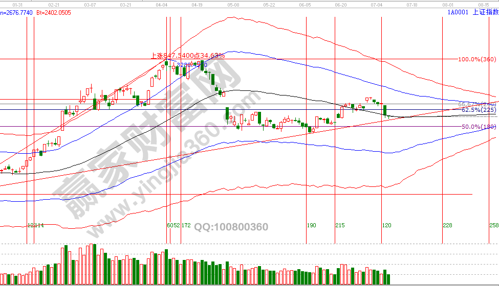 大盤全天在贏家江恩系統極反通道黑色生命線下震蕩,盤中反擊時短周期走勢力度不夠,保持待指數到達60分鐘極反通道藍色下軌線后再做解讀觀點。近日關注震蕩時,如盤中下探觸及至60分鐘關鍵位市場表現,是否有參與性機會,出現信號會在贏家江恩學員區做動態解讀,新周期的修整結束標志是收復江恩波段百分比零度位2966點,對于反彈博弈位,應該按工具規則買在支撐,待指數未來突破2966就錯過最佳位,不理解原因就好好思考贏家江恩投資十六字真言“看大做小、看長做短、牛長熊短、紅肥綠瘦”。7月10號盤中壓力是225度2944點、270度2961點,盤中支撐是135度2911點、90度2894點。操作策略,指數回踩至極反通道生命線處,2822反彈動作還未明確結束,時間窗口附近關注2894、2878點,未來一段時間整體持倉保持3成左右。