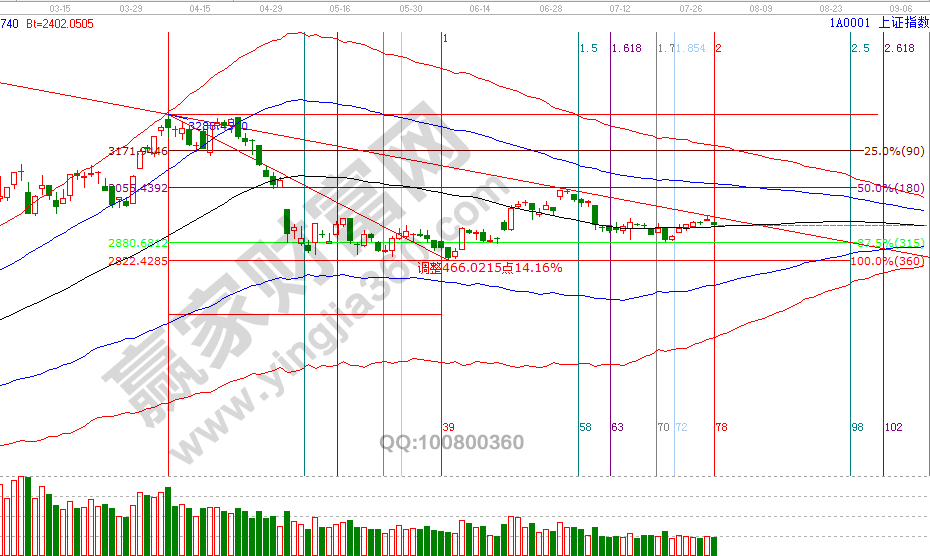 自29號開始在分析中強調有持倉的投資者這幾天跟蹤好盤面動向,30號上攻日線百分比零度位2966點(最高2965誤差1個點)時談到不再適合開新倉,昨天低開低走,已收盤數據分析,指數依然在分析的關鍵線日線生命線與60分鐘生命線共振位2928點上方,1號是8月首個日線時間窗口,關注好時間窗口,K線與趨勢線的關系來決定短線倉位去留。8月1號盤中壓力是225度2944點、270度2961點,盤中支撐是180度2928點、135度2911點。操作策略,指數極反通道生命線震蕩,指數失守60分鐘生命線則反彈信號結束,向上則關注60分藍色上軌線也有望形成反彈結束信號,投資者保持3成。