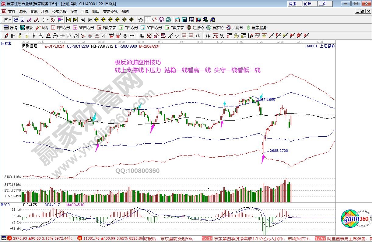 ★依據(jù)贏家江恩系統(tǒng)自由時間價格計算器(江恩箱)分析:指數(shù)收盤正好在上升3*2線2970一點不差,按規(guī)則短期看多。