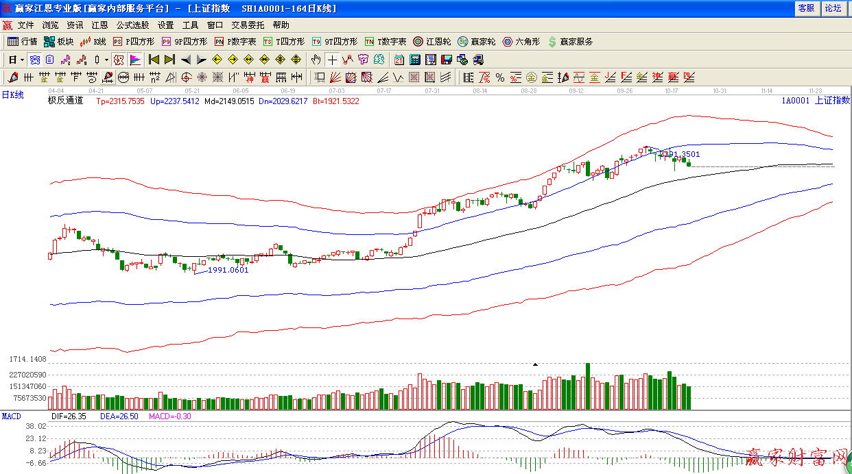 ★依據贏家江恩系統極反通道提示:在藍色外軌線之下,繼續回落,生命線支撐2290附近,短期依然保持謹慎態度。