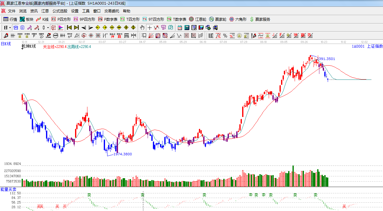 ☆依據贏家江恩系統乾坤K線提示:紅色關注線之下,藍色休息區,看空。