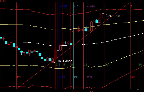 大盤上個交易日高開高走再度拉高直擊極反通道紅色外軌線,今日是自1949點運行反彈的費氏時間21天,參考歷史數據得出紅色外軌線歷史觸碰次數較少,每次運行至此都會有調整,投資者結合極反通道各周期配合來制定計劃,短生命線支撐2235-2245,外軌線阻力2290-2294;
