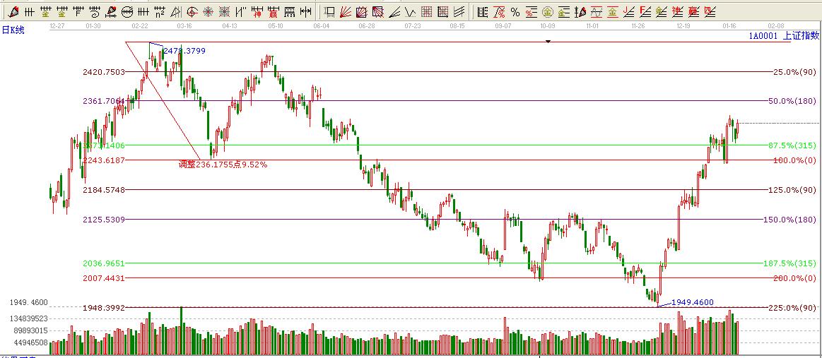 綜上所述:大盤仍運行在315度位置2270構成短期強支撐。極反通道紅色上軌2361第一壓力。