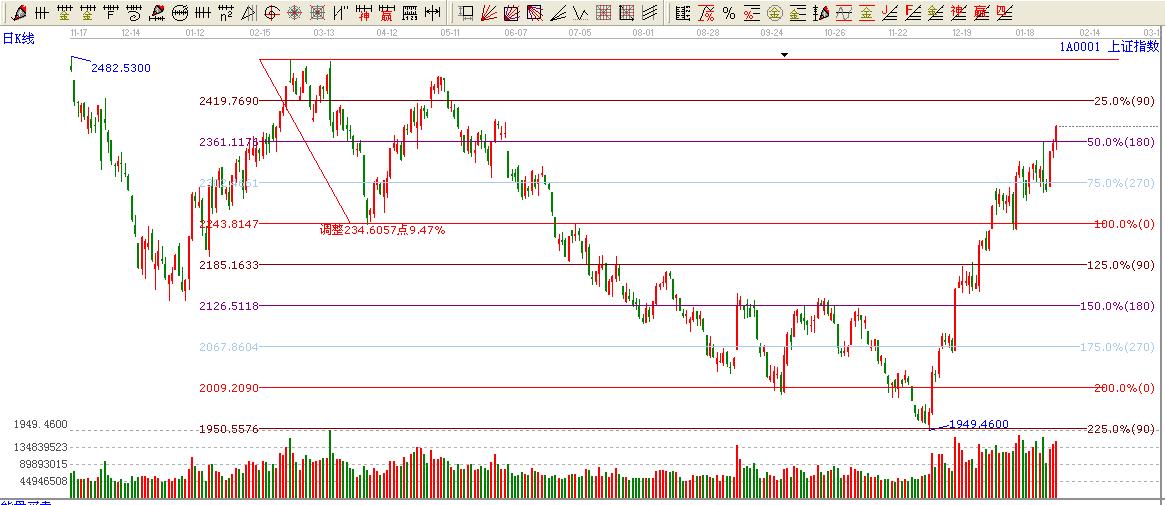 ★依據贏家波段百分比伸線提示:大盤收盤在180度2360壓力上方,短期壓力變支撐。只要不破這里才會看高至90度位置2420附近。