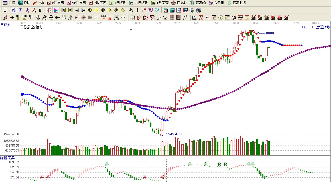★依據(jù)贏家江恩多空戰(zhàn)線提示:目前大盤運(yùn)行在長期紫色多空線上方,短期藍(lán)色線上方,謹(jǐn)慎做多。